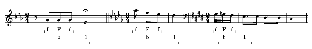 Gestos distintos como, por exemplo, o motivo da Quinta Sinfonia de Beethoven, o primeiro gesto do Concerto para piano em Sib de Tchaikovsky, ou o primeiro gesto do choro Odeon, têm uma característica em comum – a nota mais forte e longa está localizada no final do gesto, e a anacruse forma uma estrutura com três notas iguais, com perfil fraco-Forte-fraco. Dizemos que esse inciso no todo é iâmbico (fraco-Forte), com a parte fraca subdividida em uma estrutura anfibráquica (fraco-Forte-fraco). Esse perfil é cifrado como b1, sendo que a letra b representa a estrutura subdividida (fraco-Forte-fraco) situada na parte fraca do perfil, e o número 1 representa a parte forte, no final do gesto.