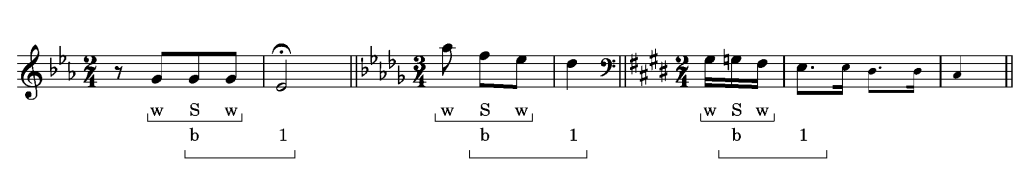 Distinct gestures such as, for example, the motif of Beethoven’s Fifth Symphony, the opening gesture of Tchaikovsky’s Piano Concerto in B-flat, or the first gesture of the “Odeon” Brazilian choro, share a common characteristic – the strongest and longest note is located at the end of the gesture, and the upbeat forms a structure with three notes of equal durations, with a weak-Strong-weak profile. We say that this phrase as a whole is iambic (weak-Strong), with the weak part subdivided into an amphibrachic structure (weak-Strong-weak). This profile is encoded as [b1], where the letter b represents the subdivided structure (weak-Strong-weak) located in the weak part of the profile, and the number 1 represents the strong part at the end of the gesture.
